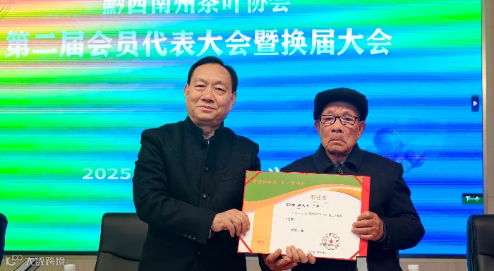 當大會進行至表彰環(huán)節(jié),會場人們的眼光匯聚在一位長者身上——原晴隆縣農(nóng)業(yè)局高級農(nóng)藝師盧其明。這位發(fā)現(xiàn)164萬年前世界唯一茶籽化石的老人,如同一株深山的古茶樹,靜默中連接著茶樹生命的浩渺源頭。當新任會長黃健勇躬身呈上朱紅的總顧問聘書,兩雙手緊緊相握的瞬間,現(xiàn)場迸發(fā)出雷鳴般的掌聲,那是后輩對拓荒者最深的敬意,是產(chǎn)業(yè)對歷史根脈最誠的朝拜,象征著守望的薪火與開拓的使命悄然傳遞。