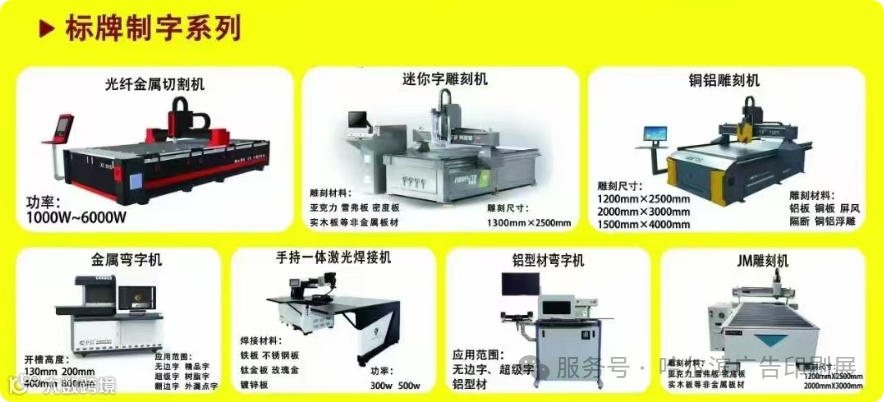 主要產品:廣告雕刻機、木工雕刻機、石材雕刻機、壓電寫真機、迷你字雕刻機、光纖激光切割機、UV平板、金屬激光切割機、金屬彎字開槽機、激光焊字機、非金屬激光雕刻切割機、激光打標機、刻字機、刻章機等。