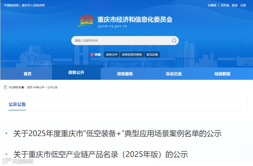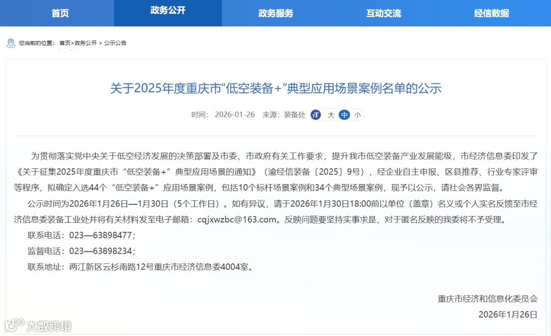 導(dǎo)讀:1月26日,重慶市經(jīng)信委發(fā)布2025年度重慶市“低空裝備+”典型應(yīng)用場景案例名單和重慶市低空產(chǎn)業(yè)鏈產(chǎn)品名錄(2025年版)進行公示 。