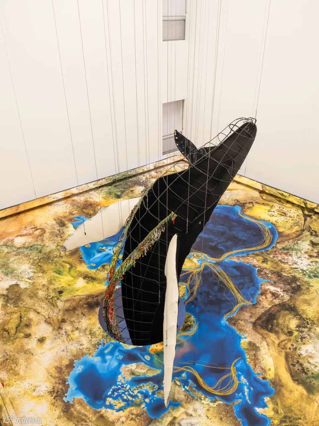 展覽的公共維度進一步延伸至浦東美術(shù)館B1空間。在該展廳,藝術(shù)家與來自上海多所學(xué)校的學(xué)生共同完成裝置作品“幽靈網(wǎng)”。作為“鯨魚的致敬”的衍生裝置,該作品采用從海洋中真實回收的廢棄漁網(wǎng)作為主要材料,這些長期漂浮于海洋中的“幽靈網(wǎng)”被視為海洋生命面臨的最致命威脅之一。