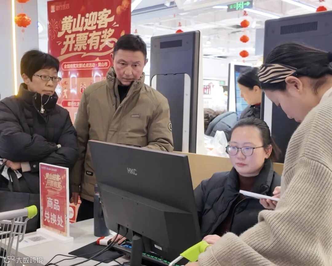 “中獎了中獎了!”2月11日,在湯貓子life超市天盈店里,市民何佳芯完成購物后,并沒有立刻離開。她拿出手機,將剛開具的180元數(shù)字電子發(fā)票拍照上傳至“開票有獎”活動端口。屏幕上的抽獎大轉盤飛速旋轉,幾秒后定格,看著彈出的40元獎金,何佳芯說:“以前開發(fā)票像是‘走過場’,現(xiàn)在還能抽獎,消費者多了一分期待!”