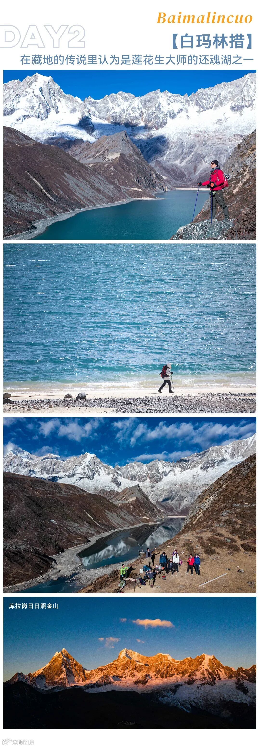 早起前往白瑪林措湖邊拍攝日照金山,徒步探索白瑪林措湖,沿途可見雪山倒影、冰川遺跡及高原湖泊,傍晚返回措玉村。