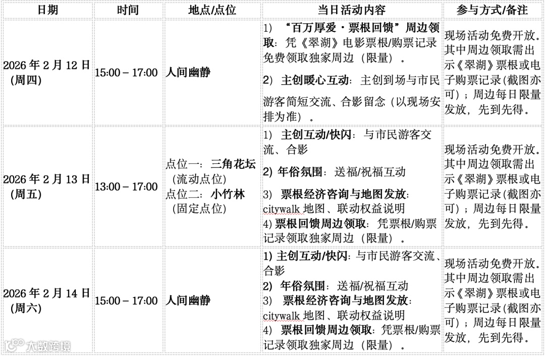 活動現(xiàn)場還將開展書法家送福、導(dǎo)演主創(chuàng)答謝影迷、文創(chuàng)周邊贈送等活動,設(shè)置歸鄉(xiāng)回饋專場,市民游客憑電影《翠湖》票根或購票記錄,可免費領(lǐng)取獨家電影周邊,并有機會與影片主創(chuàng)進行互動交流,增強節(jié)慶氛圍和群眾參與感,讓《翠湖》影迷與翠湖游客共賀新春。