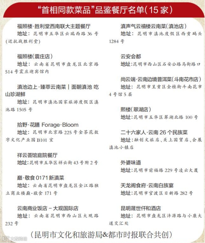 首批公布的餐廳包括福照樓·勝利堂西南聯(lián)大主題餐廳、滇池邊上·臻萃云南菜、拾野·花膳Forage·Bloom、祥云薈館庭院餐廳、云安會都、尚云端等15家特色餐飲企業(yè)。在這些餐企中,很多家都能提供首相菜單上的完整菜品。