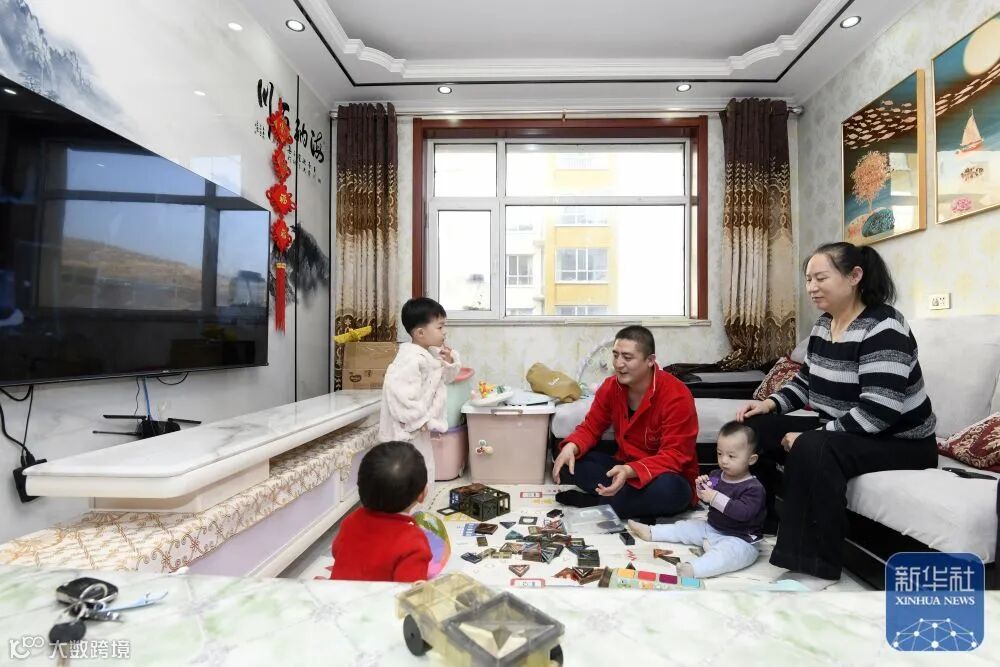 在臨縣湫水柏林苑易地扶貧搬遷安置點(diǎn),從臨縣叢羅峪鎮(zhèn)馬家山村搬遷來的村民郭奇亮(中)和家人在屋里玩耍(11月27日攝)。新華社發(fā)(劉亮亮 攝)