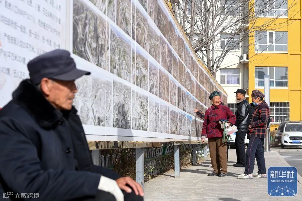 在臨縣湫水柏林苑易地扶貧搬遷安置點(diǎn),村民在廣場(chǎng)上看村子的老照片(11月27日攝)。新華社發(fā)(劉亮亮 攝)