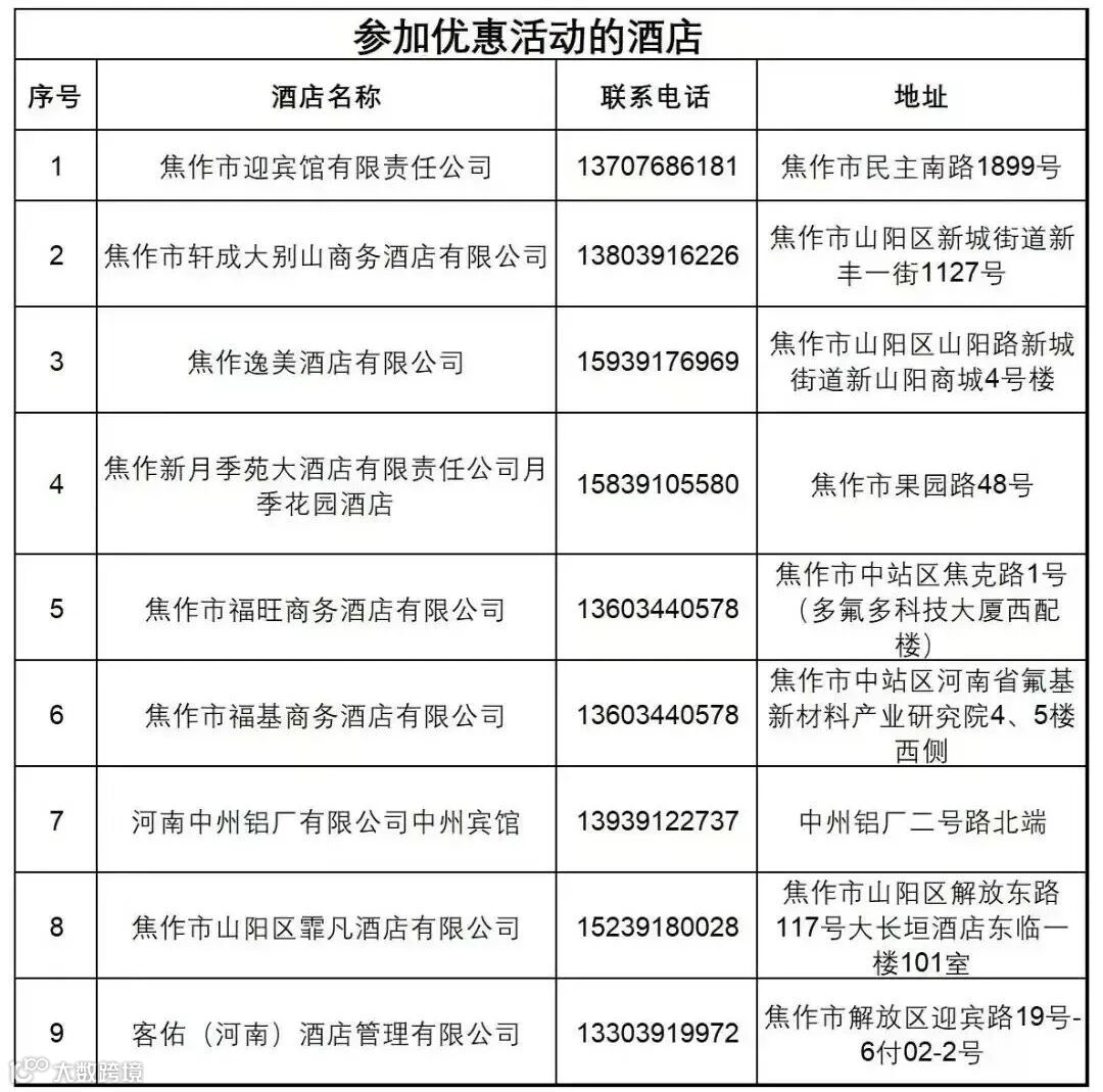 提供旅游住宿折扣。賽事期間,賽事相關(guān)人員和購(gòu)票觀眾憑相關(guān)證件或門(mén)票票根到焦作市境內(nèi)參與活動(dòng)的酒店、民宿住宿消費(fèi)可享8折優(yōu)惠(其他平臺(tái)優(yōu)惠不與此折扣疊加使用)。