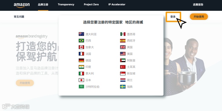 2. 點(diǎn)擊右上角“登錄”,選擇您要注冊(cè)的國家/地區(qū)的對(duì)應(yīng)站點(diǎn)。比如,您希望在美國站進(jìn)行品牌注冊(cè),此處選擇“美國”。