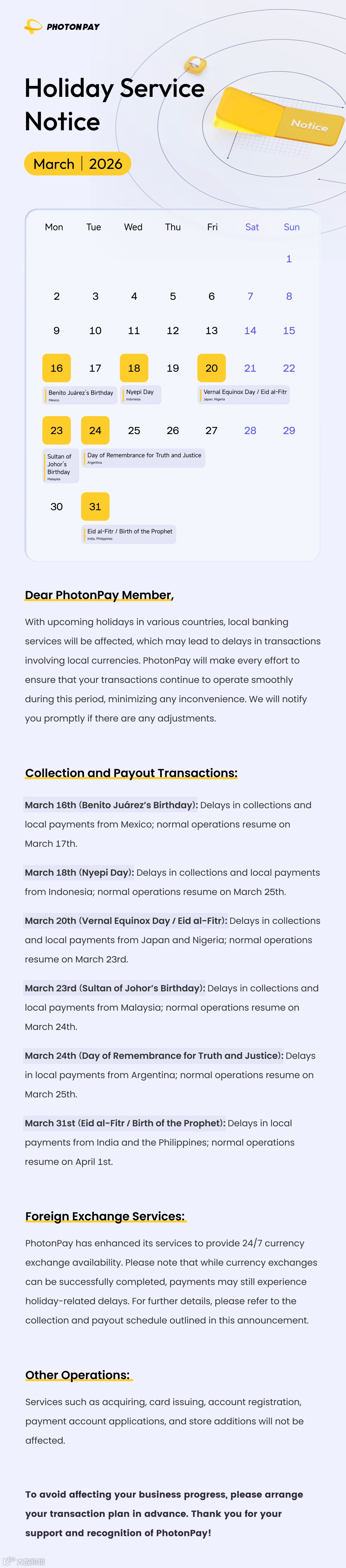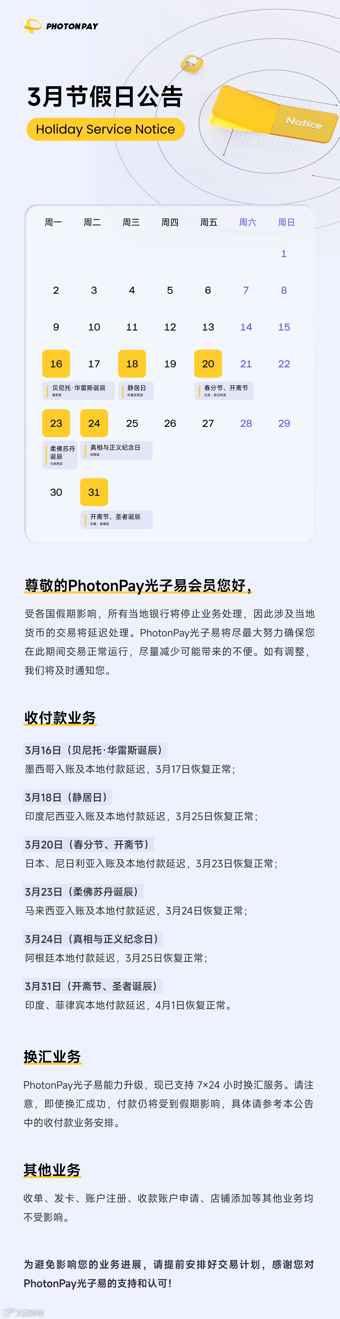 3月節(jié)假日公告|PhotonPay光子易