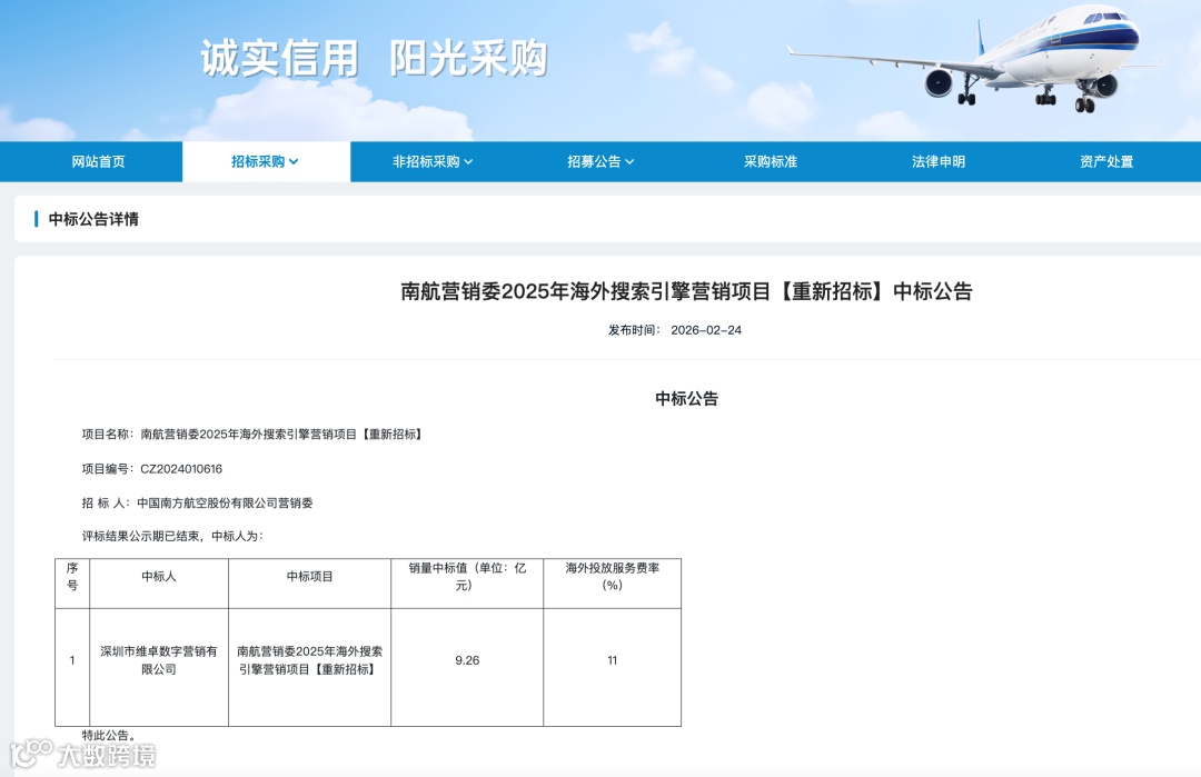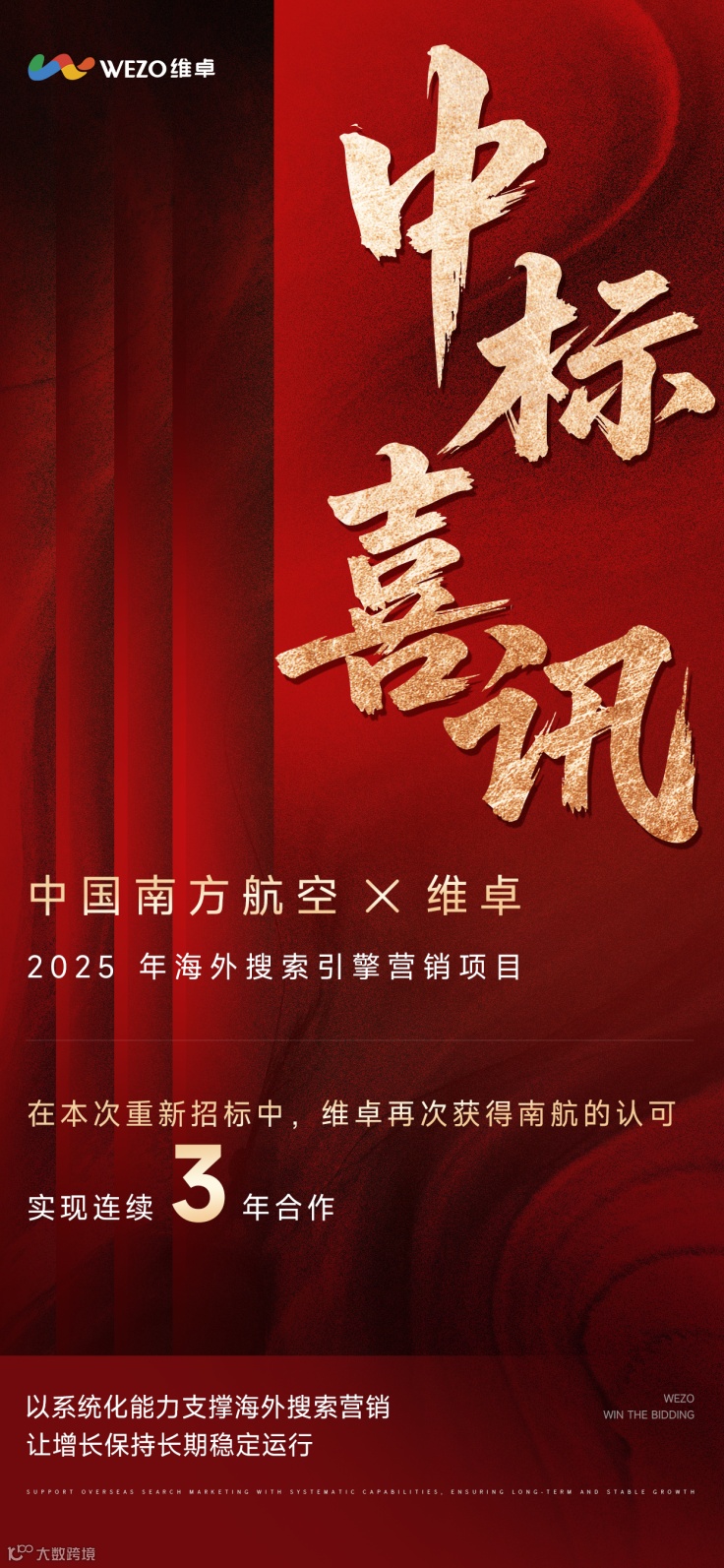 近日,維卓成功中標中國南方航空股份有限公司2025年海外搜索引擎營銷項目(服務期自2026年起)。這是維卓繼2024、2025年后,連續(xù)第三年與南航在海外數字營銷領域達成深度合作。在本次招標綜合評審中,維卓憑借突出的技術方案與整體能力,再次獲得南航營銷委員會認可。
