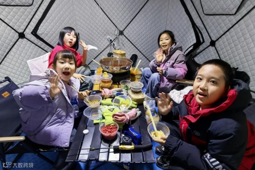 1月11日晚,克拉瑪依區(qū)金龍湖冰雪樂園,孩子們在帳篷里吃火鍋??死斠廊诿接浾?閔勇 攝