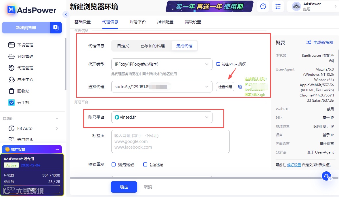 哪怕是后續(xù)做店群放大,也能靠它實(shí)現(xiàn)賬號(hào)的批量安全管理,操作起來也沒有復(fù)雜的技術(shù)門檻,只需要給每個(gè)賬號(hào)新建獨(dú)立的瀏覽器環(huán)境,綁定對(duì)應(yīng)國家的純凈 IP,后續(xù)所有賬號(hào)操作都在對(duì)應(yīng)的獨(dú)立環(huán)境內(nèi)完成即可,這也是 2026 年大陸賣家做 Vinted 的必備基礎(chǔ)工具。