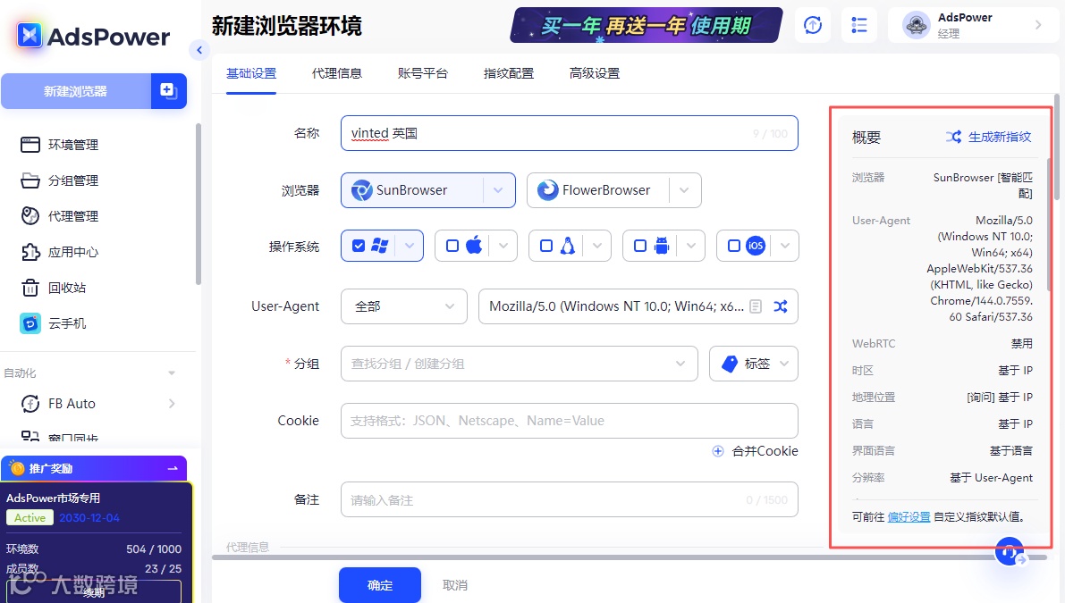 AdsPower 能給每個(gè) Vinted 店鋪配置獨(dú)立安全的瀏覽器環(huán)境,自定義User-Agent 、時(shí)區(qū)、分辨率、WebRTC 等20+指紋參數(shù)。