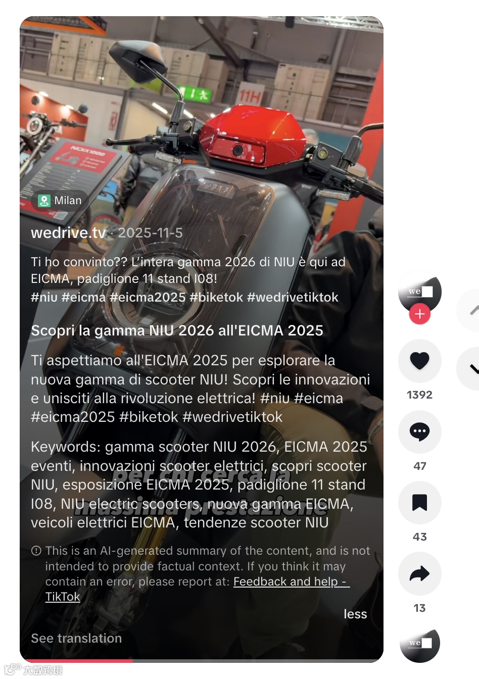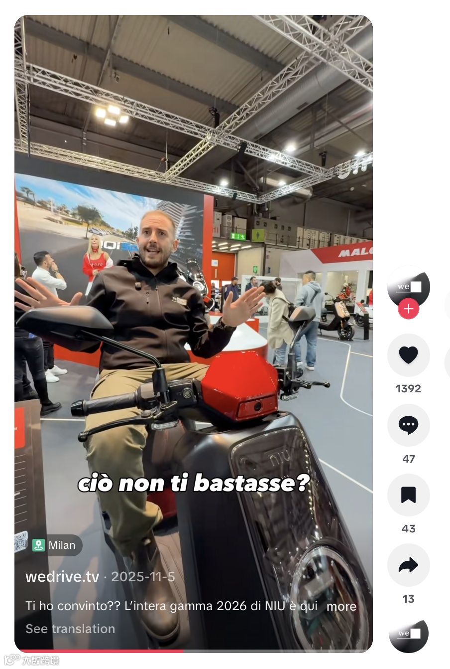 在歐洲重要兩輪車展會 EICMA 現(xiàn)場,wedrive.tv 對 NIU 2026 年新品系列進(jìn)行近景特寫、外觀展示與騎行體驗(yàn)式報(bào)道,結(jié)合意大利語講解,有效提升本地用戶代入感與可信度 [4] 。