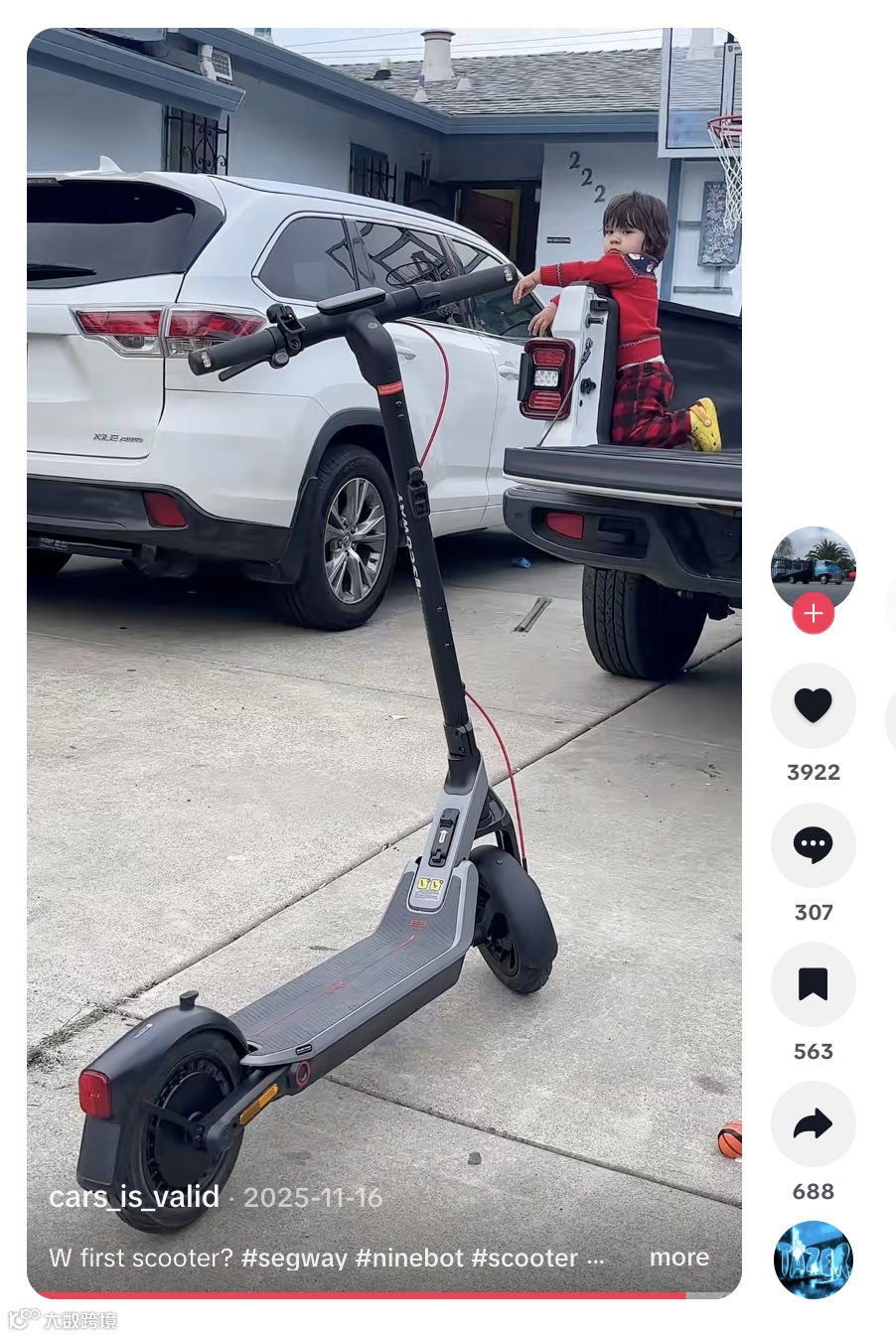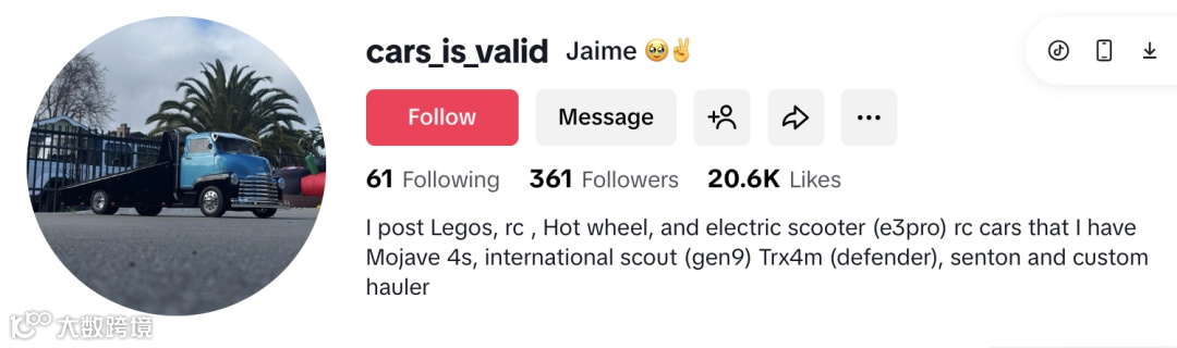 cars_is_valid 是聚焦 RC 模型、樂高車模與電動滑板車的興趣型達(dá)人,粉絲僅約 361 人,內(nèi)容以實(shí)拍體驗(yàn)、零部件細(xì)節(jié)與DIY改裝為主,具有濃厚個(gè)人視角和技術(shù)討論屬性 [13] 。