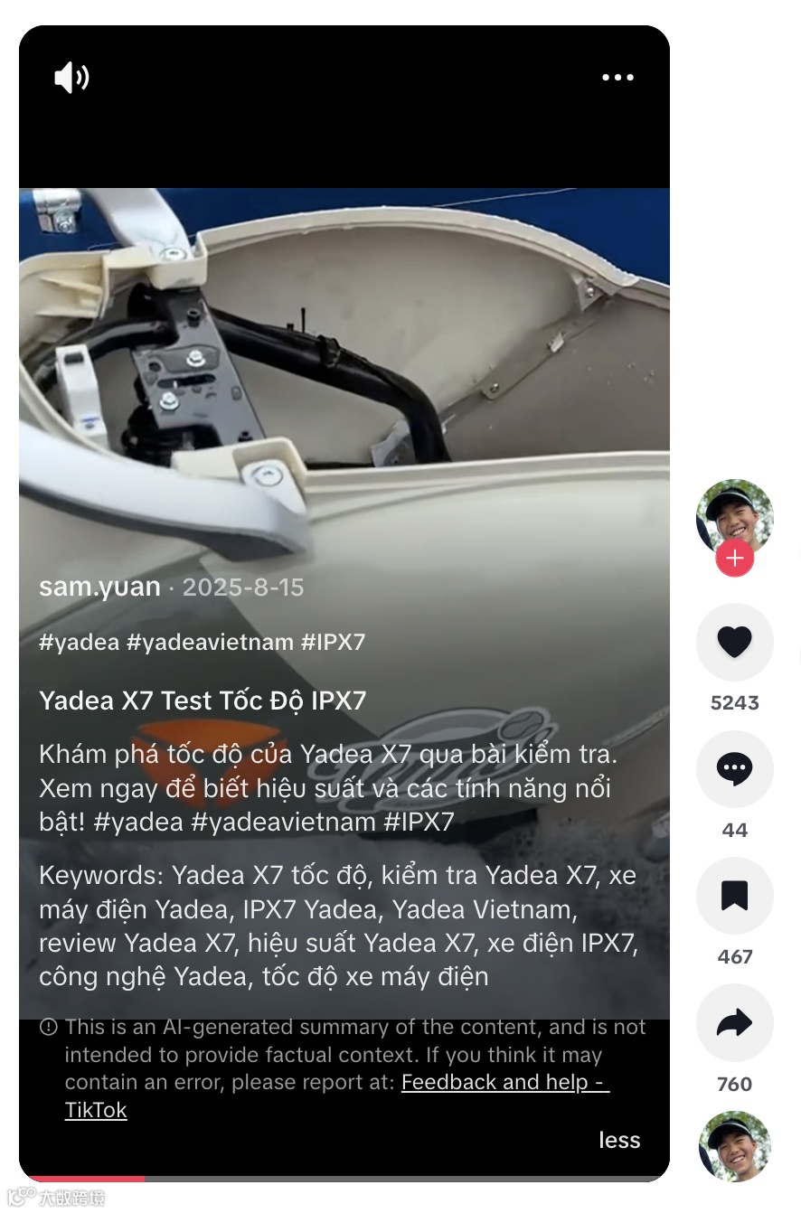 sam.yuan 憑借真實(shí)測試與生活化表達(dá),在東南亞等目標(biāo)用戶群體中為 Yadea 構(gòu)建了自然討論氛圍,成為連接品牌與普通用戶的高價(jià)值傳播節(jié)點(diǎn) [12]