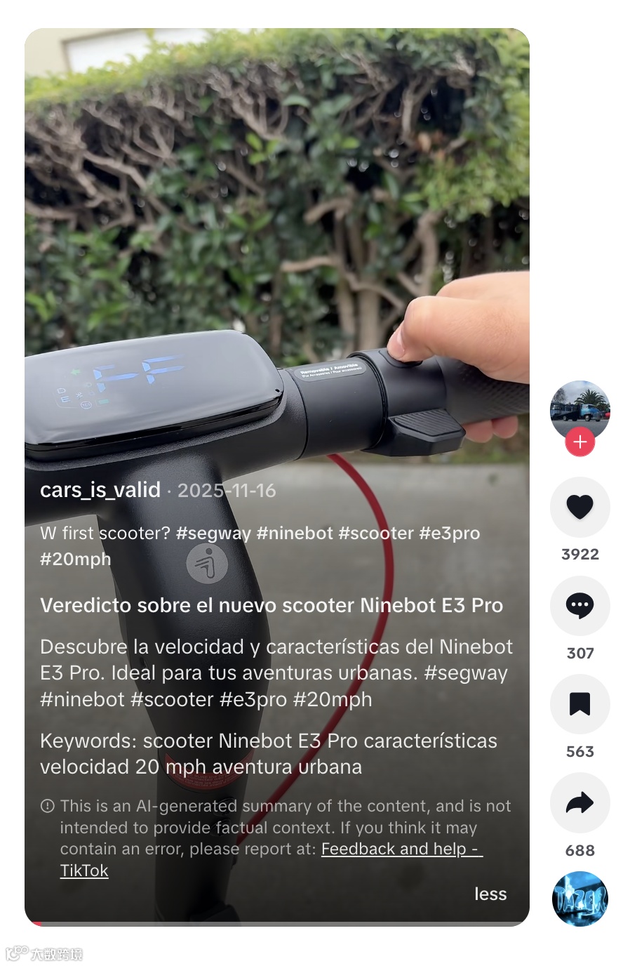 cars_is_valid 以真實(shí)測評、細(xì)節(jié)深挖與高質(zhì)量互動,在英語及西班牙語用戶中為 Segway-Ninebot 建立起細(xì)分圈層內(nèi)的技術(shù)信任,發(fā)揮“社群種草者”的關(guān)鍵作用 [17] 。