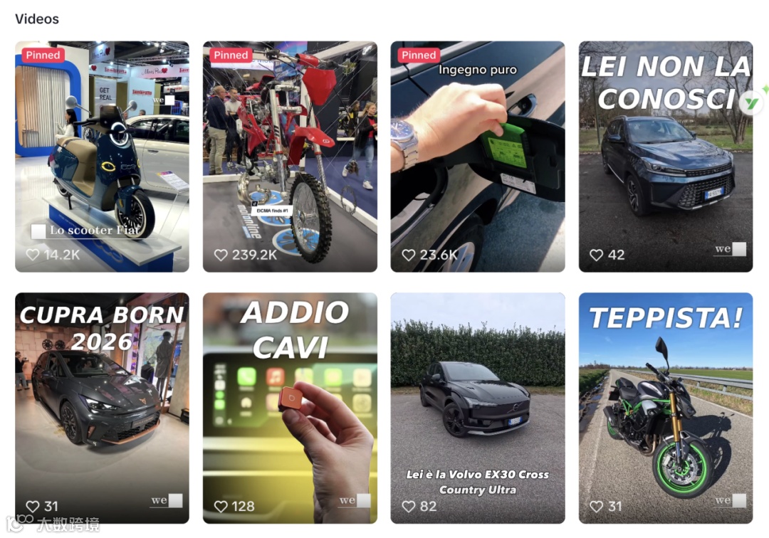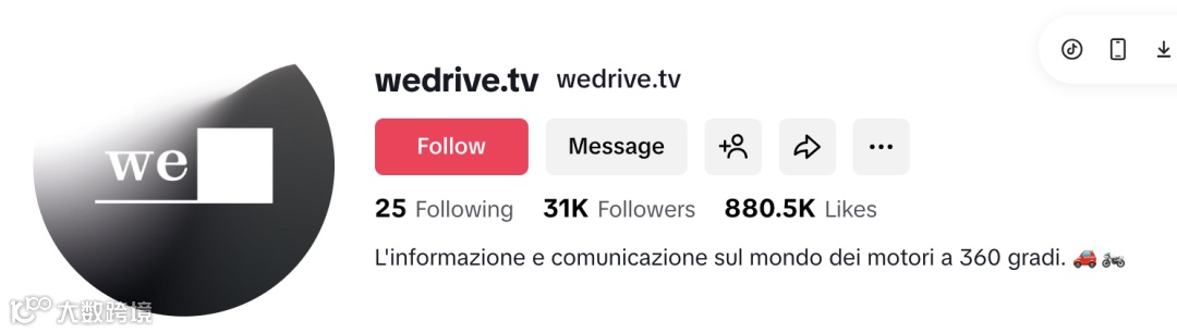 wedrive.tv 是意大利本土專注汽車與摩托車領(lǐng)域的短視頻媒體賬號,簡介以意大利語標(biāo)明“全方位汽車世界資訊與傳播”,定位清晰、品牌感強(qiáng),目前擁有約 3.1 萬粉絲 [2]