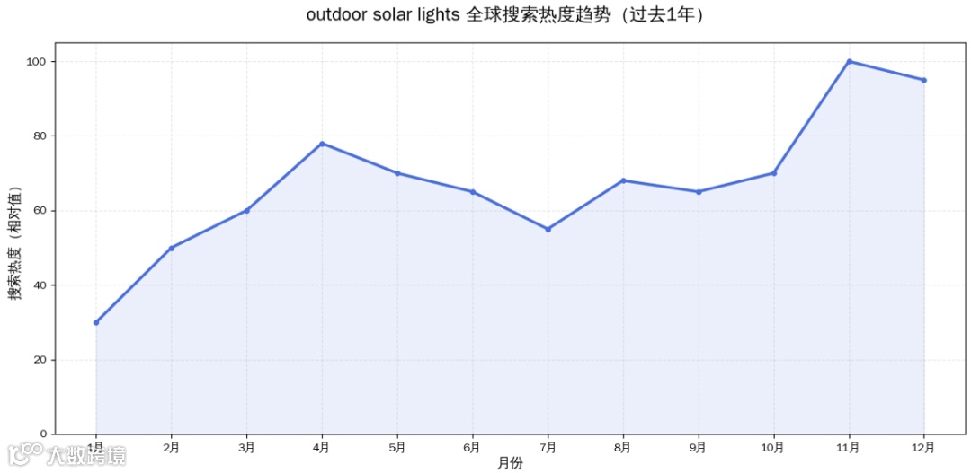 Google Trends數(shù)據(jù)顯示,“smart lighting”(智能照明)、“outdoor solar lights”(戶外太陽能燈)等關(guān)鍵詞過去一年全球搜索熱度穩(wěn)定在30–100高位區(qū)間,北美、歐洲東南亞地區(qū)興趣最為突出。