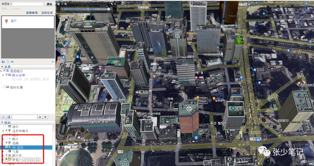 勾選對(duì)應(yīng)圖層可疊加顯示道路、3D建筑、地形、照片、天氣等信息。
