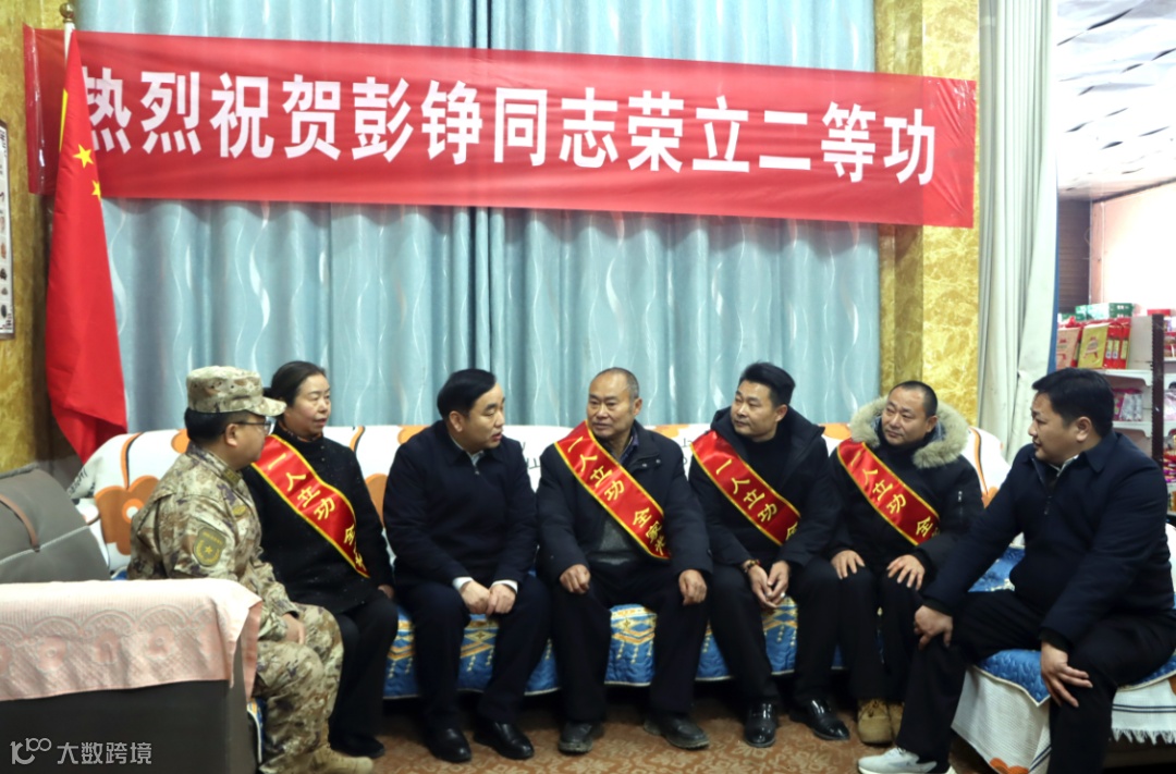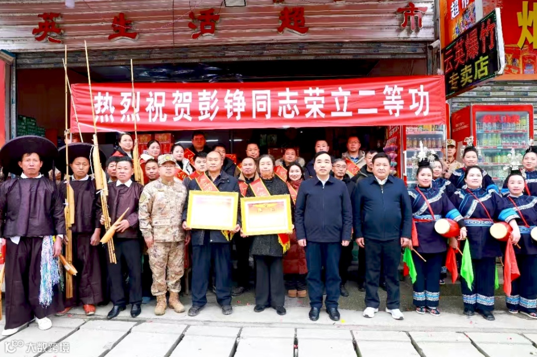 儀式現(xiàn)場莊重而熱烈,村道兩旁、庭院門前,“一人立功 全村光榮”“熱烈祝賀彭錚同志榮立二等功”等標(biāo)語格外醒目,與熠熠生輝的二等功喜報相互映襯。掌聲、喝彩聲、鑼鼓聲、蘆笙聲交織回響,鄰里鄉(xiāng)親齊聚道賀,共同見證這份屬于軍人與家庭的至高榮耀。