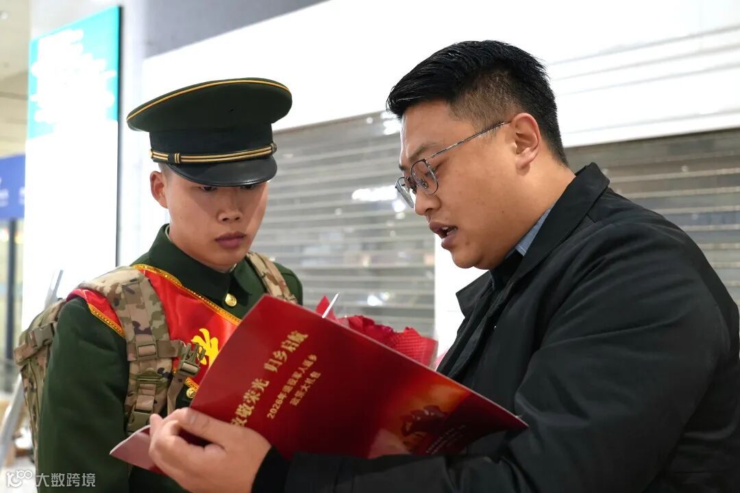 當(dāng)天上午9時(shí)許,隨著退役軍人陸續(xù)走出站口,工作人員和家屬們紛紛迎上前去,主動(dòng)接過(guò)行囊、敬獻(xiàn)鮮花、披掛綬帶,并送上專屬返鄉(xiāng)紀(jì)念禮盒?,F(xiàn)場(chǎng)工作人員細(xì)致講解返鄉(xiāng)報(bào)到所需材料及辦理流程,送上“政策大禮包”,向退役軍人致以誠(chéng)摯敬意,感謝他們?yōu)閲?guó)防建設(shè)、為家鄉(xiāng)增光添彩作出的積極貢獻(xiàn)。整個(gè)迎接儀式莊重有序,處處洋溢著尊崇軍人職業(yè)、關(guān)愛(ài)退役軍人的濃厚氛圍。