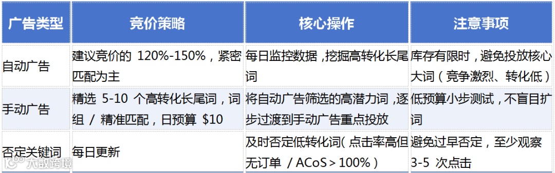 核心目標(biāo):積累數(shù)據(jù)、驗(yàn)證關(guān)鍵詞效果、控制ACoS≤30%。