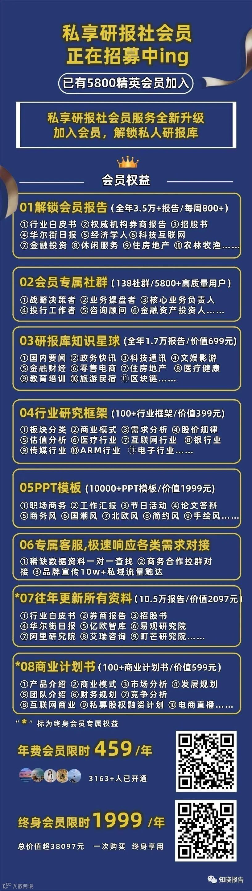知曉報(bào)告 知曉報(bào)告報(bào)告涉及200+細(xì)分行業(yè)資料,每周定期更新,全面覆蓋各行商業(yè)投資領(lǐng)域行業(yè)研究報(bào)告、行業(yè)報(bào)告,依托海量宏觀策略、行業(yè)發(fā)展規(guī)劃、上市公司、藍(lán)白皮書(shū)等研究報(bào)告,歡迎金融人士、投資商、咨詢顧問(wèn)、商業(yè)分析師等關(guān)注后回復(fù)‘1’ 進(jìn)研報(bào)分享群