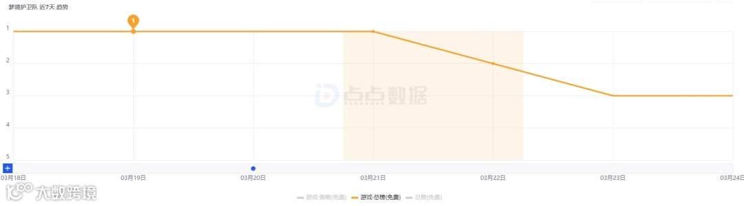 《夢境護衛(wèi)隊》3月18日在APP端正式上線,點點數(shù)據(jù)顯示,游戲iOS端在上線前一天(3月17日)已開放下載。從排名來看,《夢境護衛(wèi)隊》3月 17日便登上iOS免費榜TOP1,隨后連續(xù)4天霸榜,直至3月22日(上周日)降至第二名。