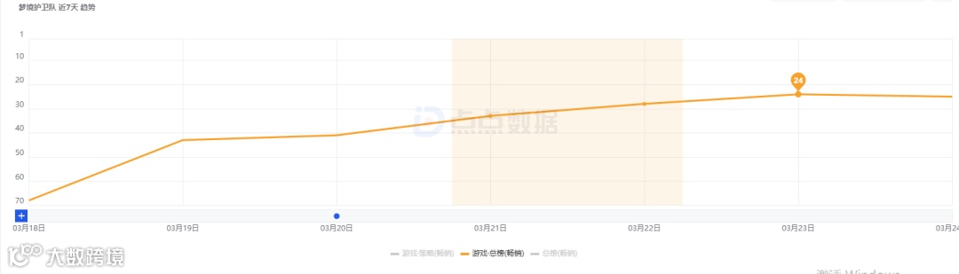 暢銷榜方面,《夢境護衛(wèi)隊》上線首日排名iOS暢銷榜第68名,隨后排名持續(xù)攀升,最高沖到第24名。截至3月24日,《夢境護衛(wèi)隊》排名iOS暢銷榜第25名。
