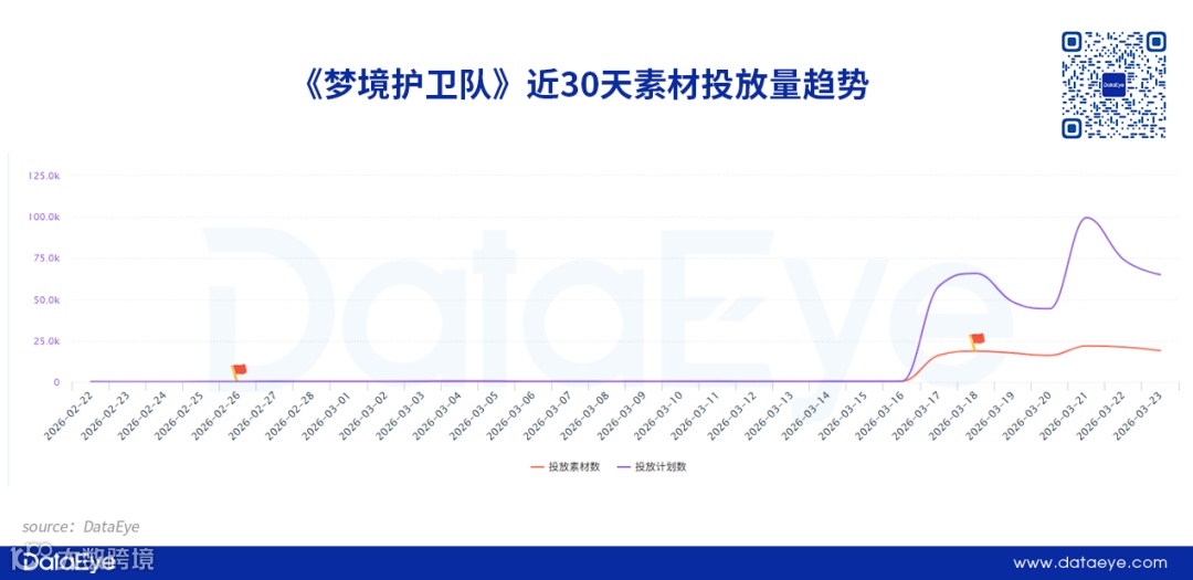 上線前一天(3月17日),《夢境護衛(wèi)隊》單日投放量暴漲至1.6萬條,上線當天升至1.8萬條。后續(xù)投放量雖有波動,但基本保持高強度素材投放。