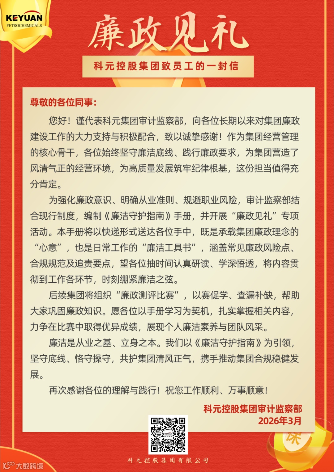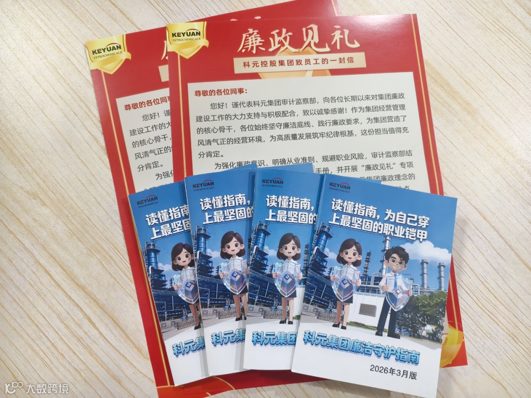 為縱深推進(jìn)廉潔文化建設(shè),擰緊全員廉潔從業(yè) “思想閥”,集團(tuán)審計監(jiān)察部開展“廉政見禮”專項行動,精心派發(fā)《科元集團(tuán)廉潔守護(hù)指南》實體手冊與《致員工的一封信》兩份廉潔禮,以紙為媒傳廉情、明規(guī)矩,讓廉潔關(guān)懷與紀(jì)律要求直達(dá)人心,筑牢企業(yè)清廉防護(hù)網(wǎng)。