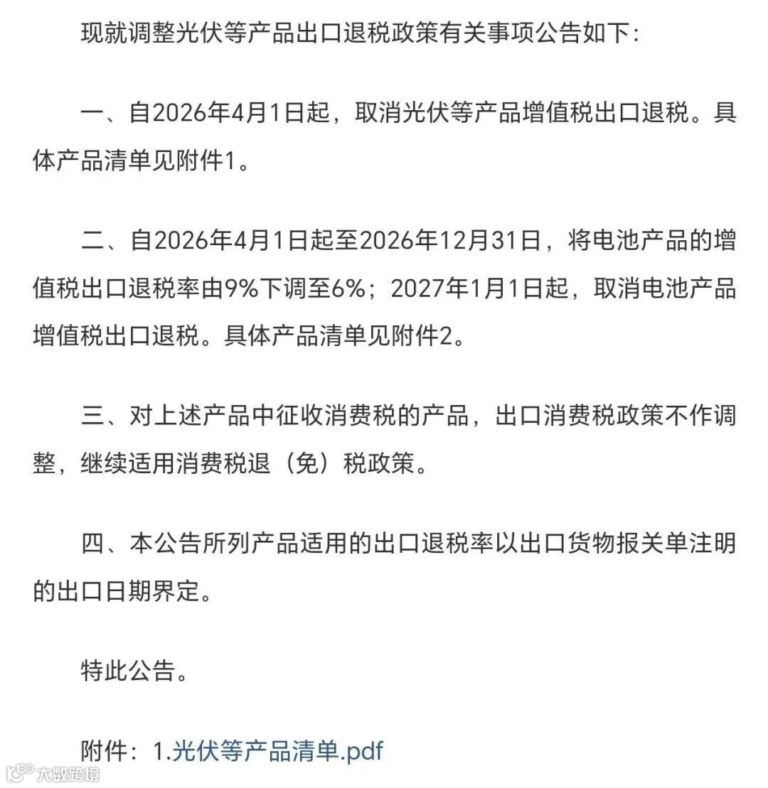 一、自2026年4月1日起,取消光伏等產(chǎn)品增值稅出口退稅。具體產(chǎn)品清單見附件1。