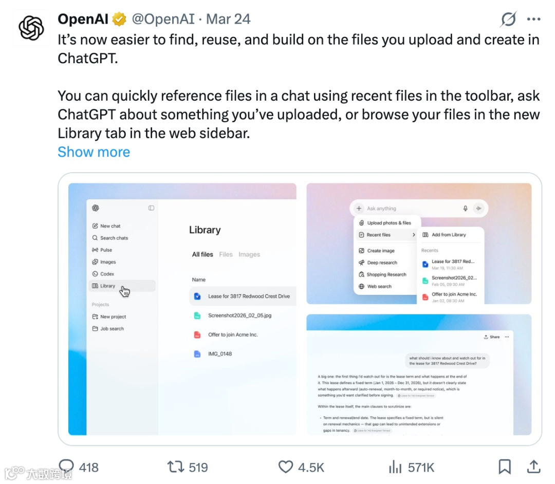 3月24日,OpenAI宣布ChatGPT新增“Library”功能,支持用戶更便捷地查找、調(diào)用與存儲(chǔ)文件。該功能目前面向Plus、Pro及Business訂閱用戶開(kāi)放。