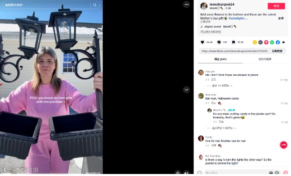 傳統(tǒng)B2B是“人找貨”,TikTok實現(xiàn)“貨找人”。當(dāng)工廠視頻——如生產(chǎn)線實景、IP44防水測試、太陽能充電過程——獲得百萬級播放,海外批發(fā)客戶(采購商、庭院設(shè)計公司等)將主動接洽。