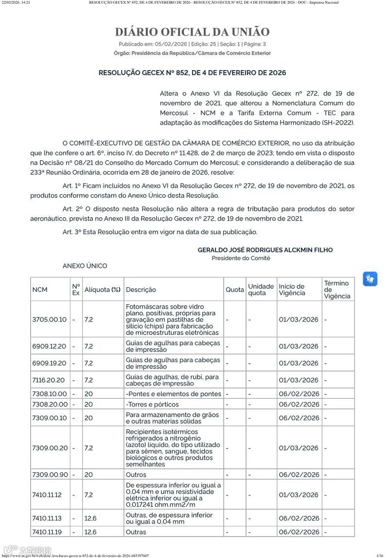近日,巴西外貿(mào)委員會管理執(zhí)行委員會(GECEX)發(fā)布公告《Resolu??o GECEX no 852, de 4 de fevereiro de 2026》(Gecex第852號決議),對1252個產(chǎn)品提高進(jìn)口關(guān)稅,許多此前關(guān)稅為0的產(chǎn)品升至7.2%,部分產(chǎn)品關(guān)稅升至12.6%或20%。