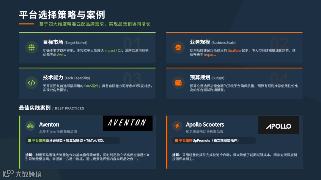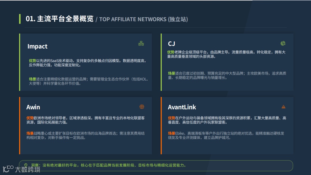 • 獨立站品牌:CJ適合中大型企業(yè);Impact以系統(tǒng)能力見長;AvantLink深耕戶外賽道資源。
