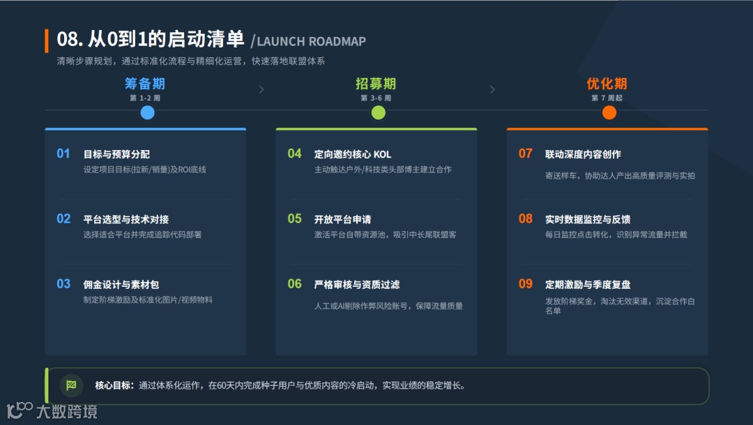 籌備期(1-2周):目標(biāo)設(shè)定、平臺選型、追蹤技術(shù)部署、素材包準(zhǔn)備。