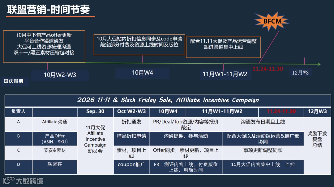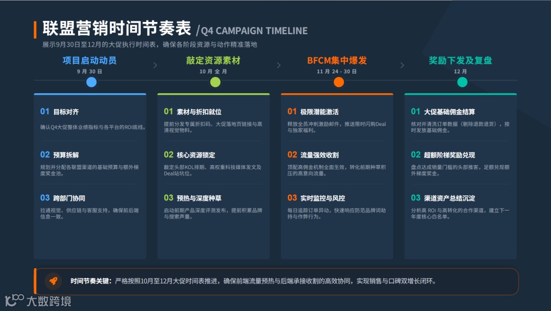 優(yōu)化期(7周+):深化內(nèi)容合作、動態(tài)調(diào)傭、數(shù)據(jù)復(fù)盤篩選核心資源。重大節(jié)點需提前3個月啟動:9月拉齊預(yù)算分工,10月鎖定KOL與素材,11月集中引爆流量。