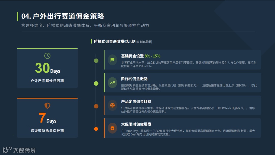 歸因邏輯直接影響伙伴積極性。高客單價類目(如Ebike)需延長歸因周期,適配真實決策路徑。優(yōu)先采用時間衰減或線性歸因模型。