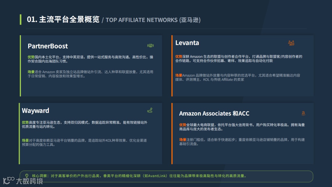• 亞馬遜生態(tài):Amazon Associates基礎(chǔ)適配;PartnerBoost工具側(cè)重站外引流與轉(zhuǎn)化承接。