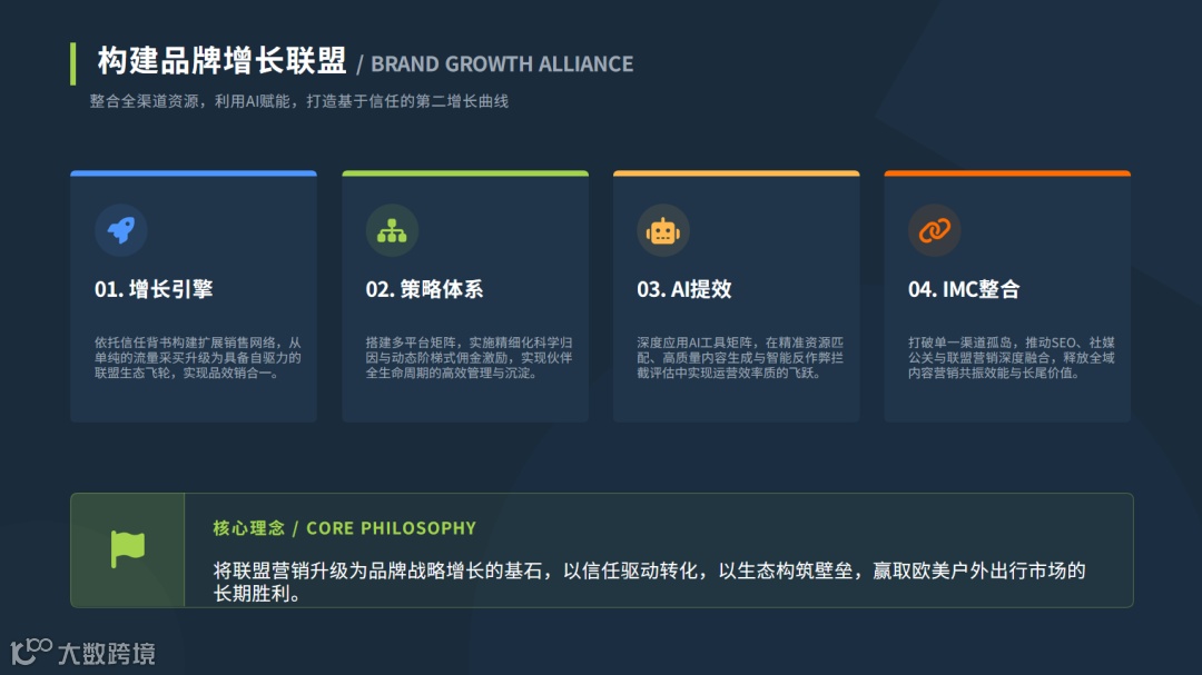 聯(lián)盟營銷的核心是構(gòu)建可持續(xù)增長系統(tǒng)——組織愿意傳遞品牌故事的伙伴,將流量采購升級為信任放大。最終實現(xiàn):聚聯(lián)盟之力,講品牌故事,贏世界之心。