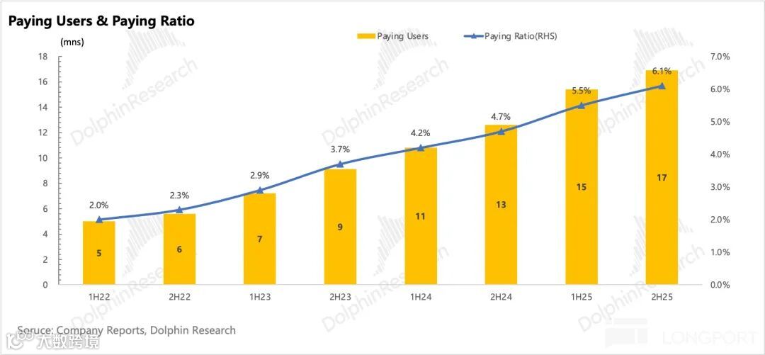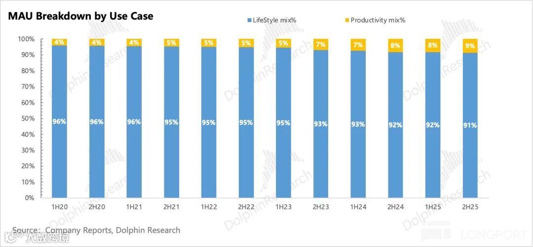 上半年訂閱用戶增長280萬,下半年放緩至150萬。由于總MAU下滑,訂閱滲透率的穩(wěn)定部分源于分母縮減,實際轉(zhuǎn)化效果存疑。生活場景滲透率達5.9%,增速平穩(wěn);生產(chǎn)力場景滲透率增速下半年從2%放緩至1.2%。