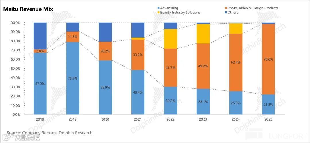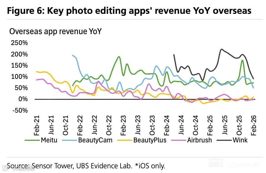 C端基本盤邏輯受挫導(dǎo)致估值下殺,但國內(nèi)圖片編輯領(lǐng)域仍為龍頭。視頻編輯產(chǎn)品Wink海外收入增速超100%,需重點關(guān)注訂閱滲透率與ARPPU而非MAU邊際變化。B端市場空間有限(約25億元人民幣),六月影像節(jié)發(fā)布的新產(chǎn)品將驗證增長彈性。