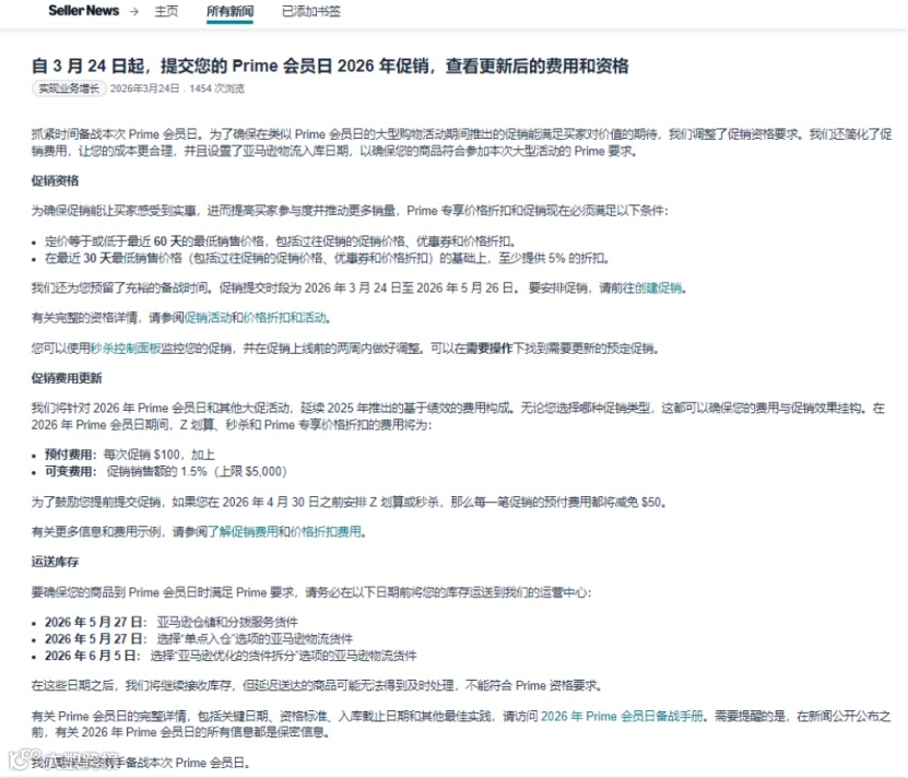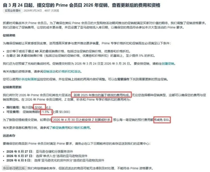 導(dǎo)讀:近期,亞馬遜美國站后臺宣布了一則重磅消息:“自3月24日起,可提交2026 Prime會員日促銷,查看更新后的費用和資格?!币簿褪钦f,今年的PD會員日促銷提報正式開始了!