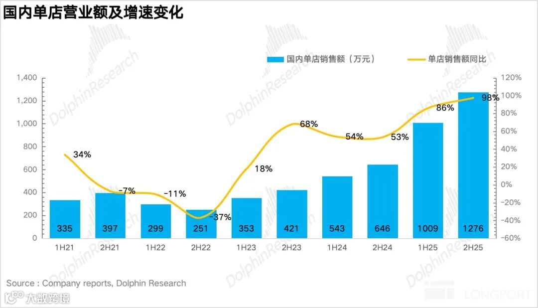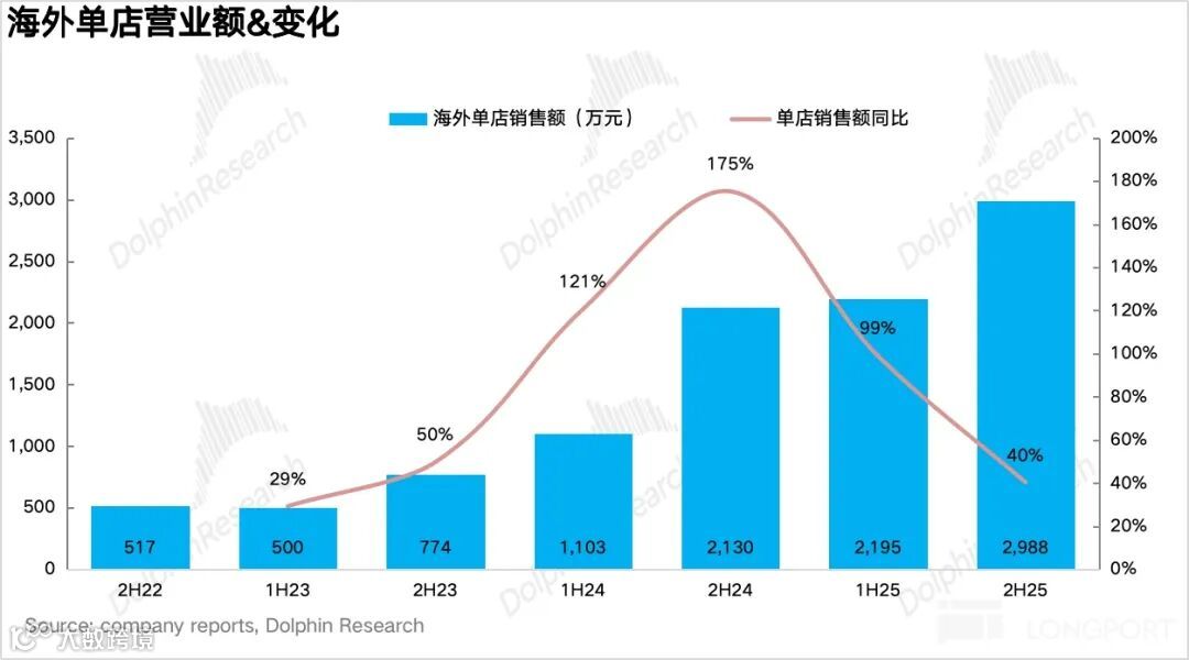 海外凈增72家門店,主要集中在北美,截至2025年底覆蓋紐約、洛杉磯等核心城市群,計(jì)劃2026年初進(jìn)駐多倫多。歐洲凈增18家門店,完成英法德意等主要國家布局;亞太地區(qū)新增16家門店,同步推進(jìn)菲律賓等東南亞市場拓展。國內(nèi)市場僅凈增2家門店,重點(diǎn)轉(zhuǎn)向高端商圈門店升級,單店平均營收達(dá)1276萬元同比增長98%。