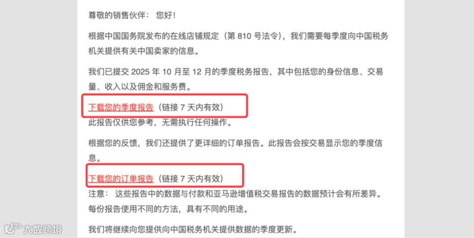 亞馬遜近日向賣家發(fā)送2025年Q4稅務(wù)數(shù)據(jù)報告郵件,該報告具有重大稅務(wù)申報指導(dǎo)意義。報告包含兩套核心數(shù)據(jù),賣家需謹慎處理。
