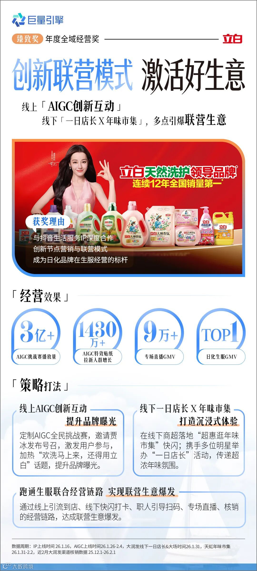 立白、納愛(ài)斯在大促節(jié)點(diǎn)深度布局全域經(jīng)營(yíng),線上整合明星營(yíng)銷、達(dá)人種草與AIGC全民挑戰(zhàn)賽提升熱度,線下通過(guò)快閃集市及商超聯(lián)營(yíng)高效承接流量,實(shí)現(xiàn)品牌聲量與商業(yè)轉(zhuǎn)化雙增長(zhǎng)。