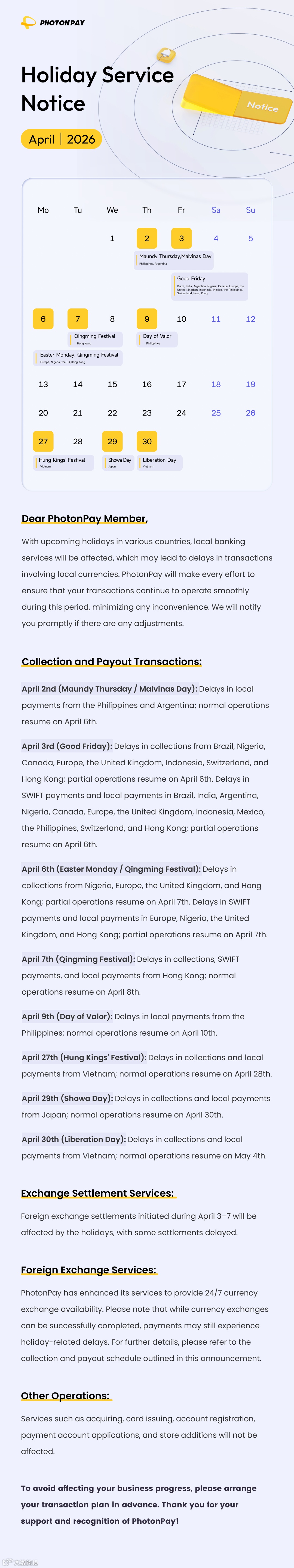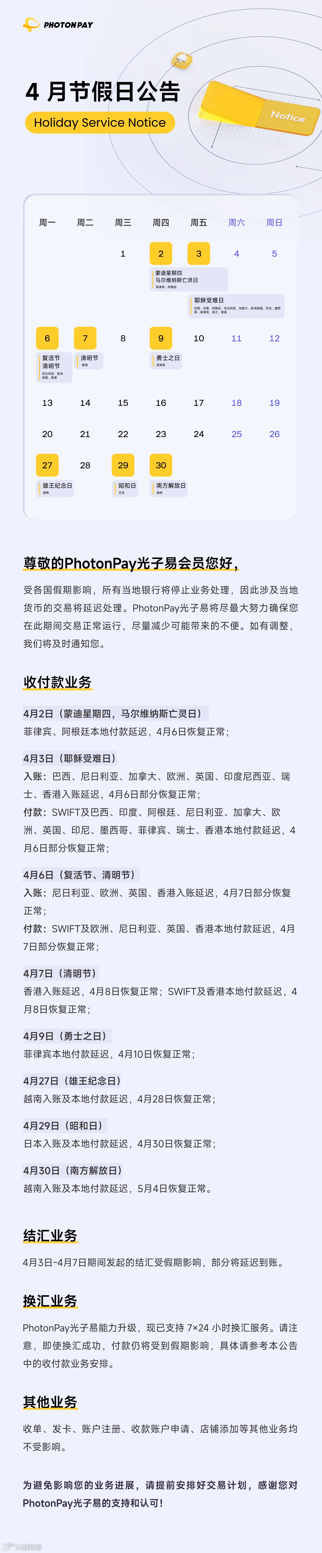 4月節(jié)假日公告|PhotonPay光子易