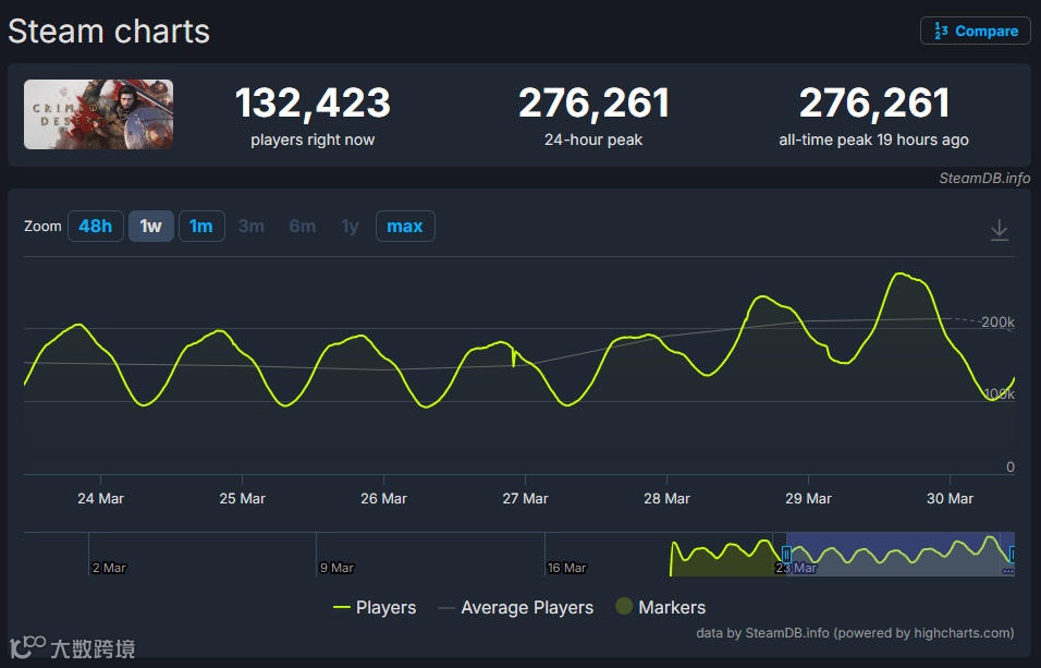 《紅色沙漠》最新更新后峰值游玩人數(shù)已經(jīng)來(lái)到27萬(wàn)人(來(lái)源:SteamDB)